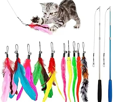 JIARON Feather Teaser Cat Toy, 2PCS Retractable Cat Wand Toys and 10PCS Replacement Teaser with Bell Refills, Interactive Catcher Teaser and Funny Exercise for Kitten or Cats.